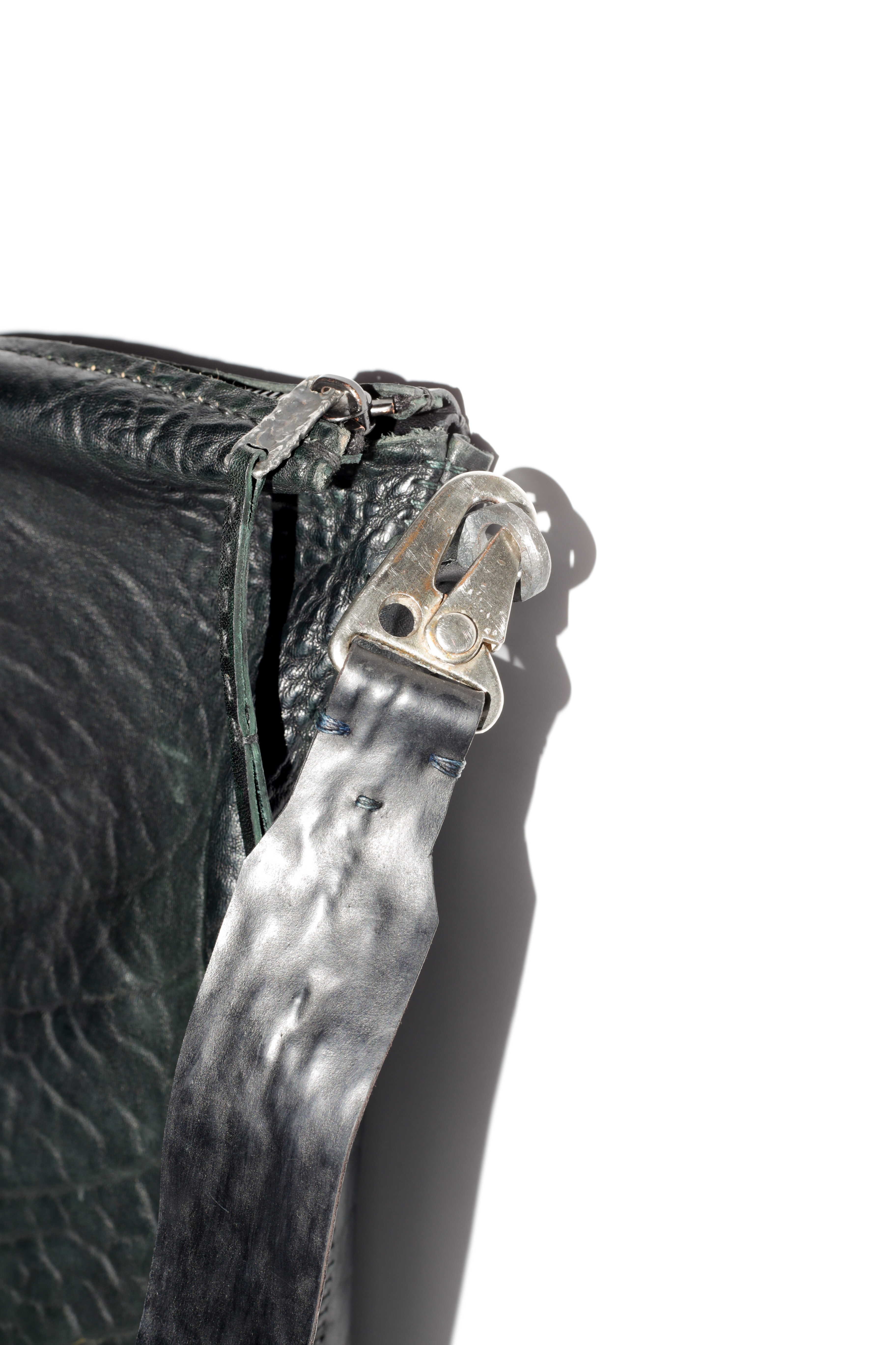 When designing the camera cases for both the Contax T2 and G1, I wanted a leather that was bullet proof. So, for this project, we selected a kangaroo leather which is 10x stronger than cowhide. In hand this leather feels strong, yet the pores of the hide add a rough texture. Sean also combines rubber and leather ( inspired by Carol Christian Poell) so he created another tonal pigment for the bottom of each camera case. This doubled as extra protection and structure.